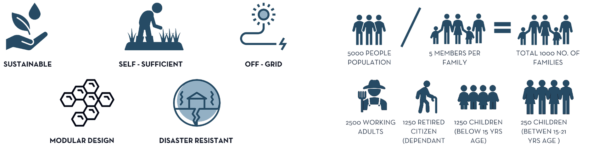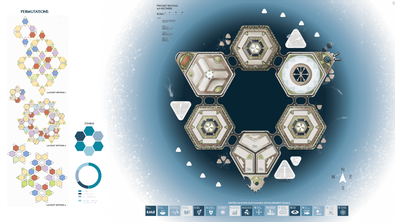 Site Plan of the 10 Hectare module consisting of 6 hexagonal module - namely 3 residential modules, 1 institutional, 1 commercial and 1 aquafarming based industrial module - of 1.6 hectare area each.