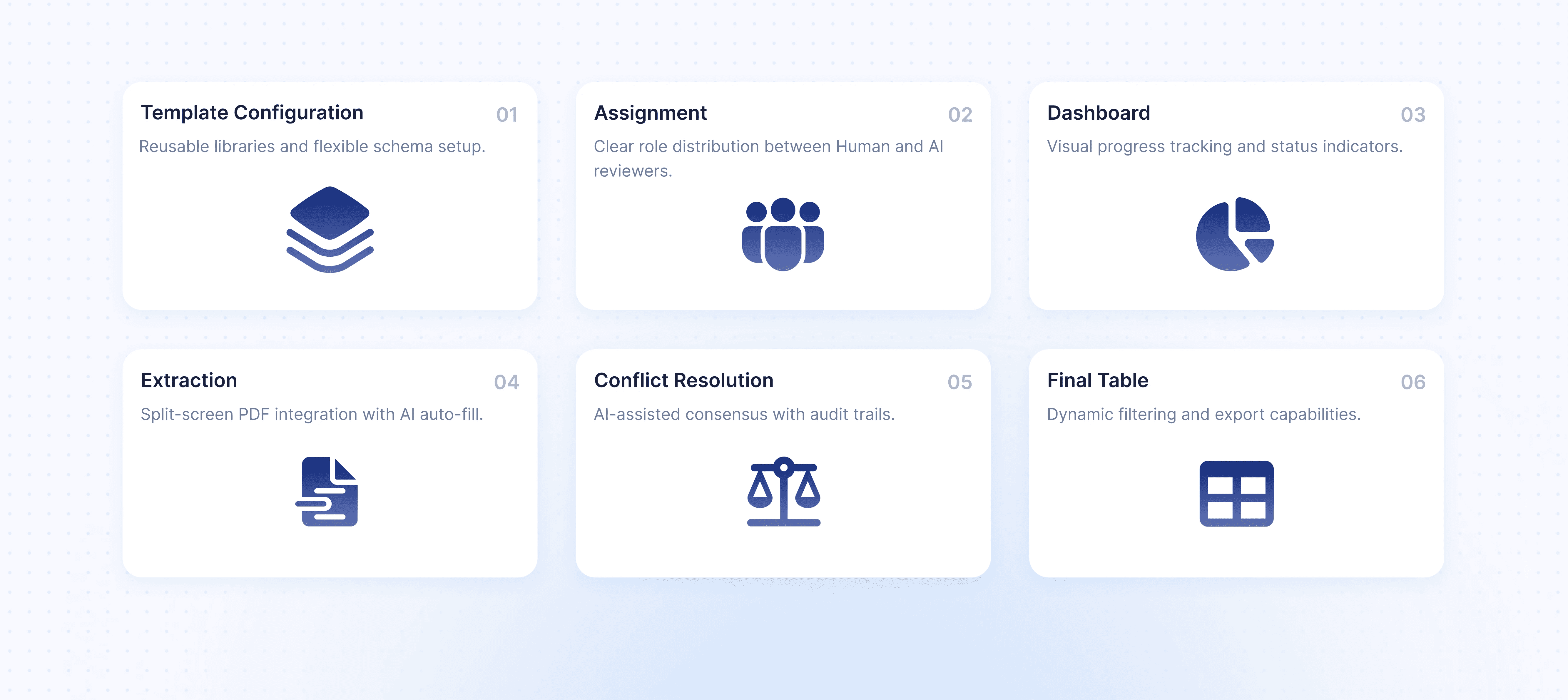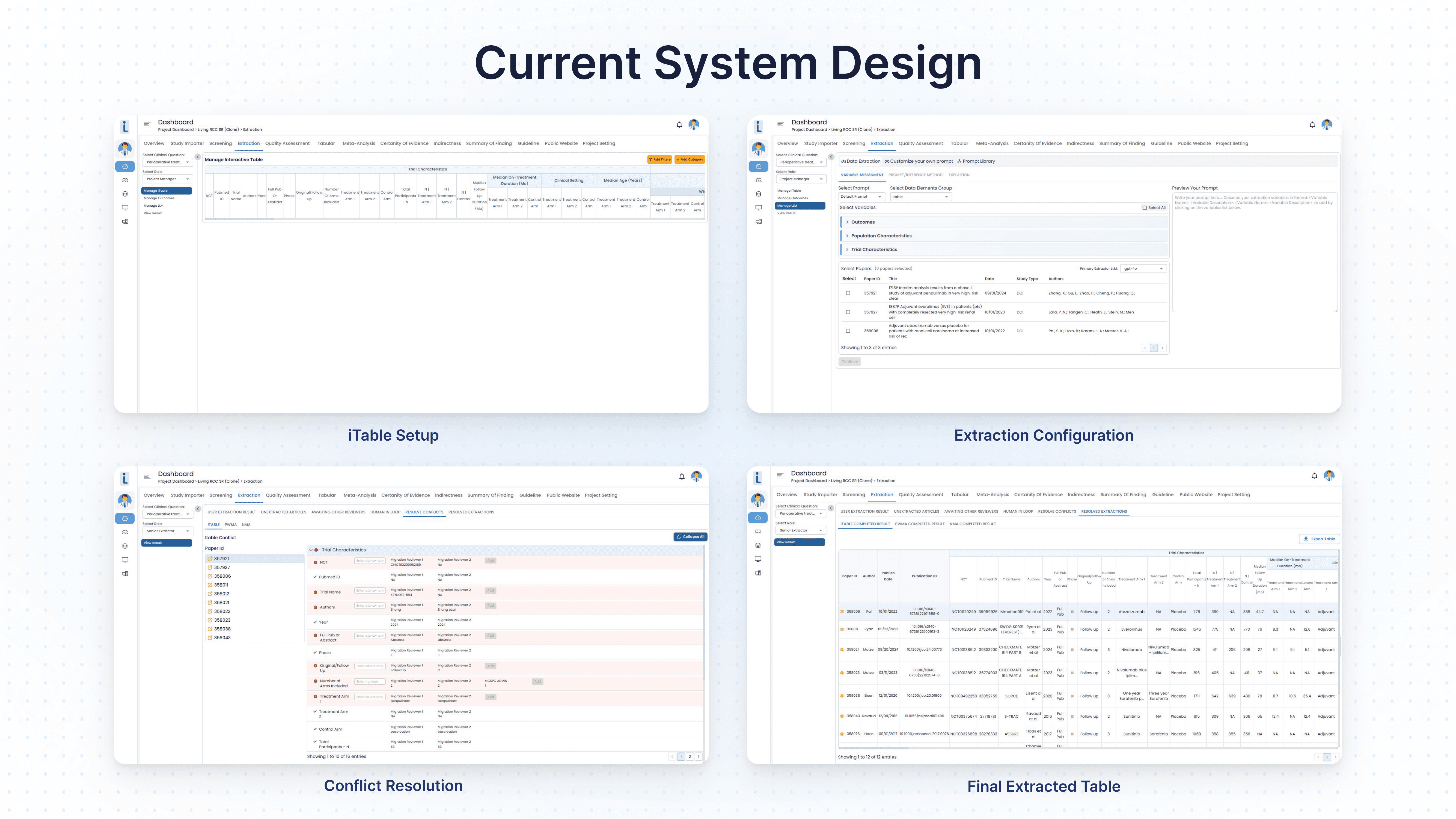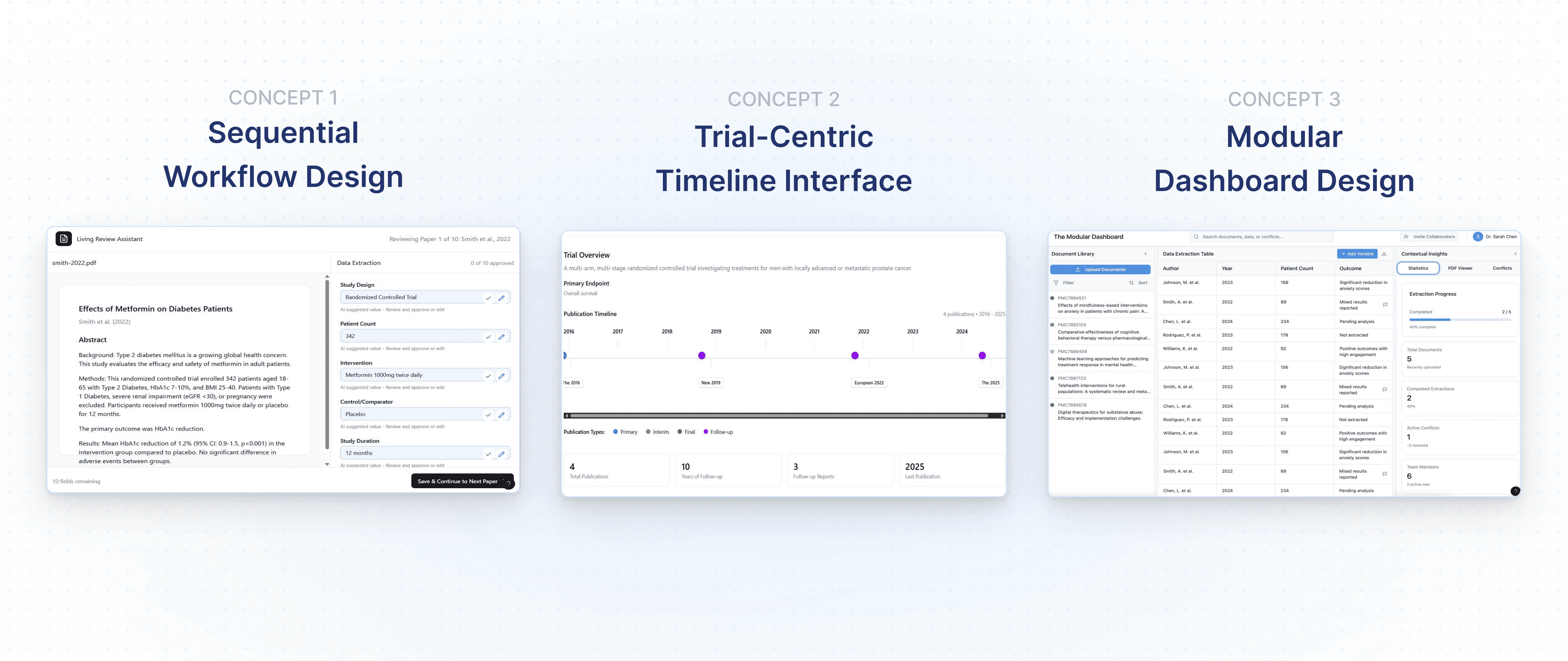 A modern Human–AI collaborative platform designed to streamline data extraction for Living Systematic Reviews. Working with Mayo Clinic subject matter experts, we redesigned the LSR workflow to reduce cognitive load, integrate transparent AI assistance, and support flexible human-only, hybrid, and AI-assisted review models. The result is a scalable, research-ready interface that accelerates evidence synthesis while maintaining clinical rigor.