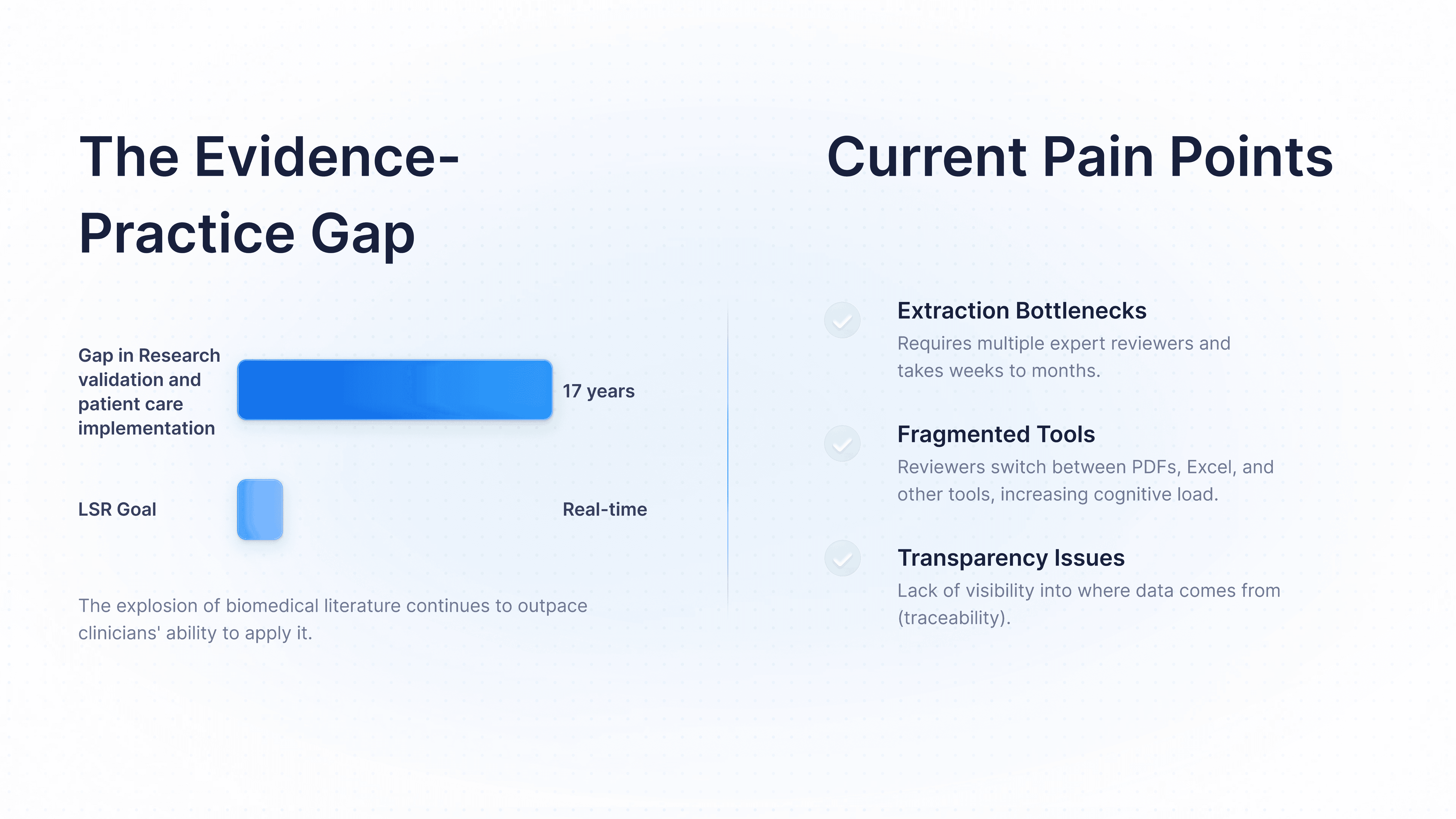 Living Systematic Reviews are designed to keep medical evidence continuously up to date, yet the workflows that support them remain slow, fragmented, and cognitively demanding. Reviewers must manually extract and verify data across thousands of PDFs using disconnected tools, leading to fatigue, delays, and increased risk of error. While AI has the potential to accelerate this process, existing solutions lack the transparency and traceability required for clinical trust. These challenges are not merely operational inefficiencies, they directly impact how quickly validated evidence reaches clinical practice.