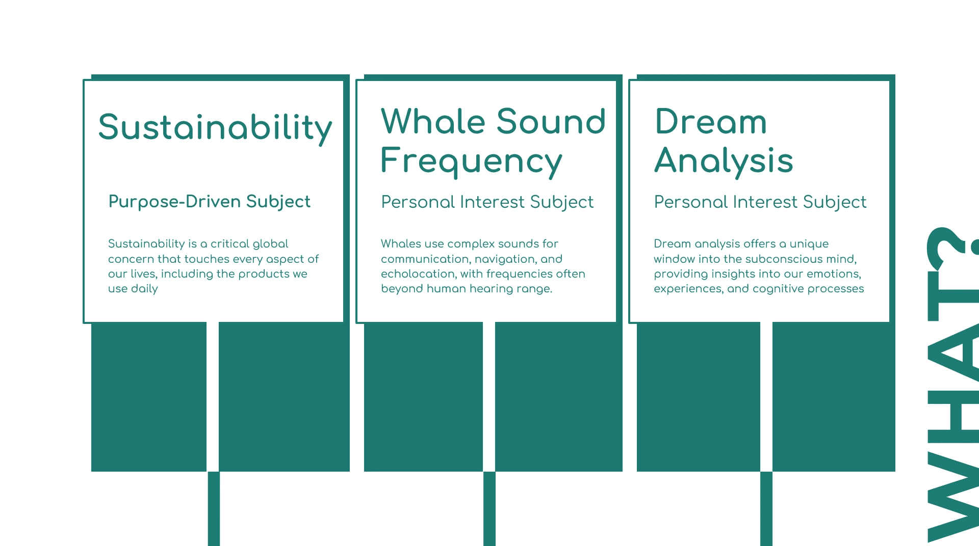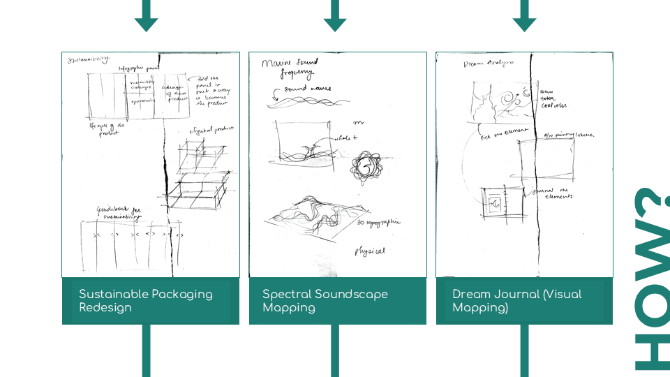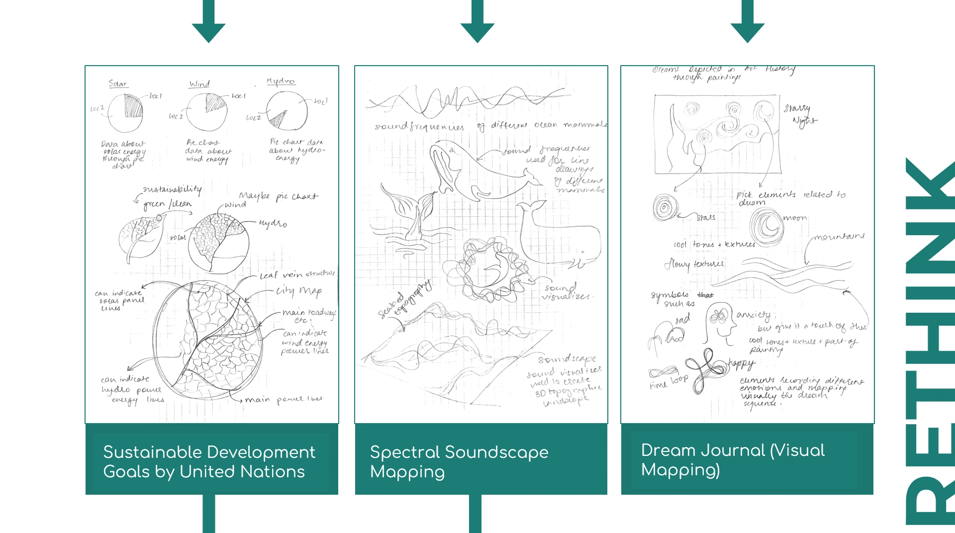 This project explores the intersection of sustainability, sound frequency (specifically whale vocalizations), and dream analysis through visual mapping and innovative design methodologies. It aims to translate complex scientific and psychological concepts into accessible and engaging visual representations, fostering awareness and understanding.